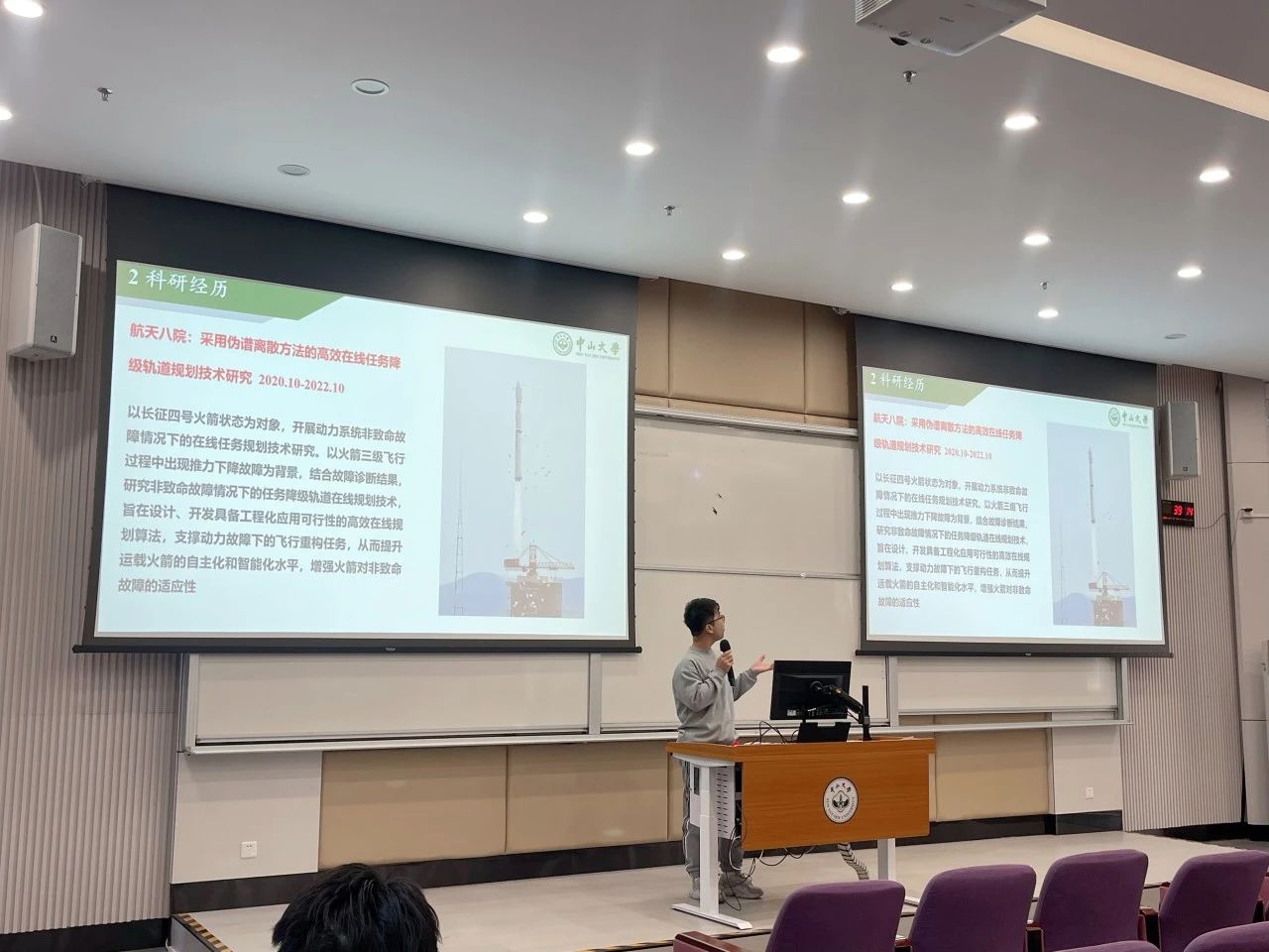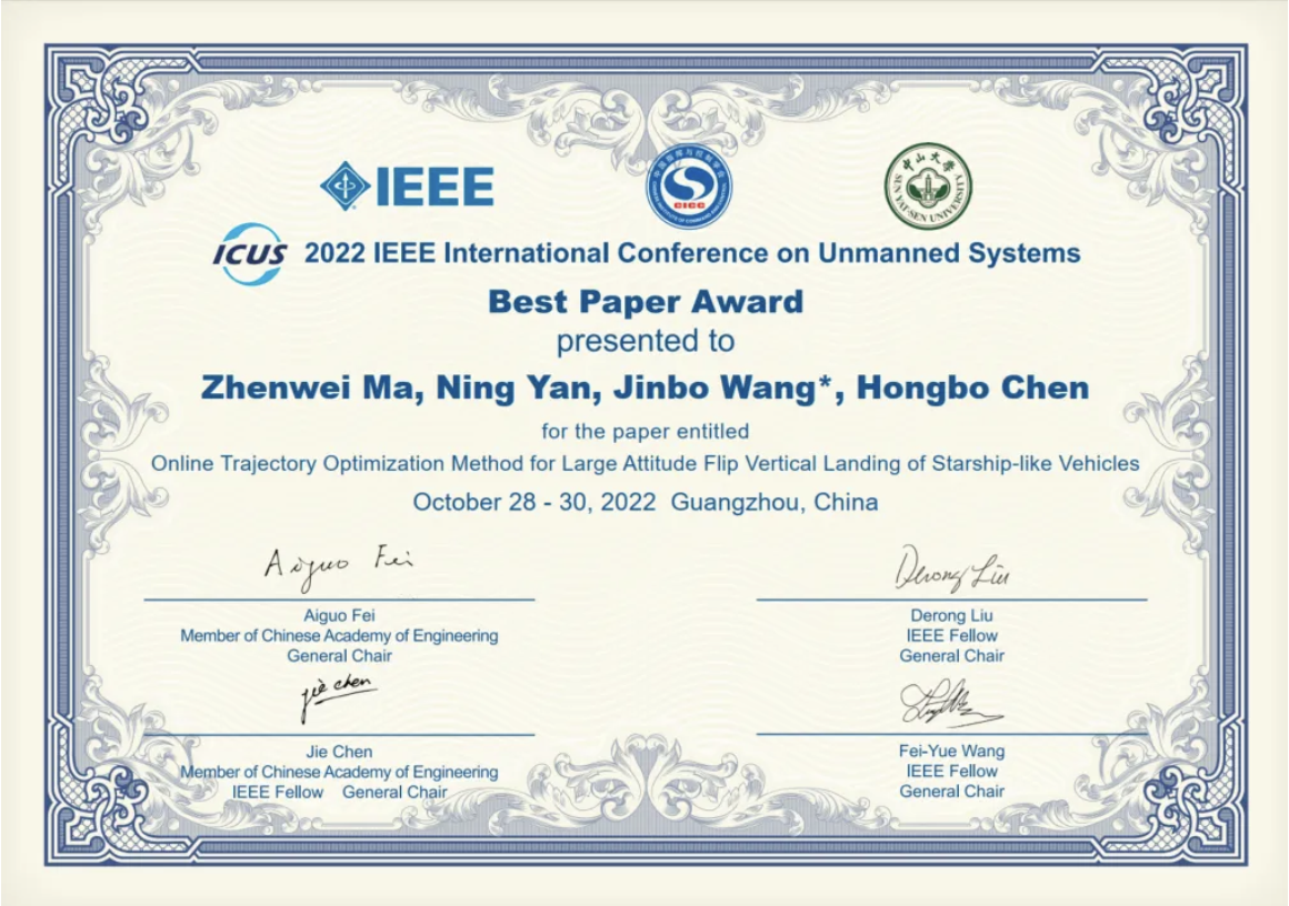 在陈洪波教授和王劲博副教授的指导下,马振伟博士参与了多项科研项目。令他最深刻的是,在2022年春节过年期间,马振伟与团队的老师和同学们,仍废寝忘食在研发火箭动力系统故障下的弹道重构算法。2022年8月,他们的研究成果在太原卫星发射基地进行的火箭发射中搭载。面对成绩,马振伟博士认为这只是对某一个阶段努力的认可,作为一位研究人员,更多要树立起接续奋斗的决心,面临日后科研道路上的更多挑战。