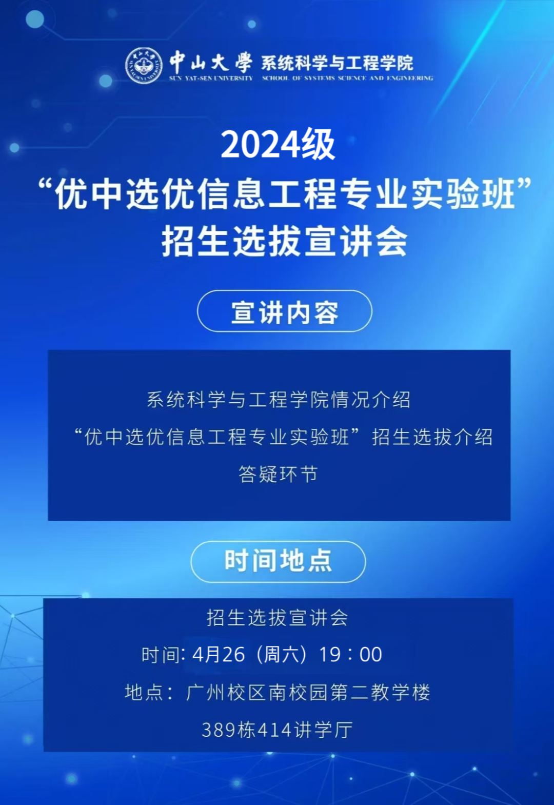 为保障系统工程总体性人才生源质量,培养复合型信息工程创新人才,现启动2024级“优中选优信息工程专业实验班”招生选拔工作,相关事宜通知如下: