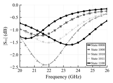 2. 基于本研究开发的RIS单元在K波段实现卓越性能:工作频段覆盖20-26GHz,相位调控范围约352°;在22-23GHz核心频段展现完美线性响应(R²=0.9991),拓展至21.523GHz仍保持R²=0.9989的高线性度;主要编码状态反射损耗<1.6dB,保证宽带信号无畸变反射与群时延稳定,为高频宽带波束赋形提供可靠硬件基础。