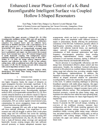 3.项目研究成果已被欧洲天线与传播国际会议EuCAP 2026接收,系统阐述基于旋转工字型谐振器的相位控制机理、PIN二极管编码状态设计及性能优化策略,为6G通信RIS技术发展提供理论支撑与工程参考。