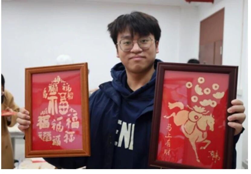 活动现场气氛热烈非凡,师生们小心翼翼地将金箔贴附于红色底板之上,勾勒出一匹匹形态各异、栩栩如生的骏马形象。今年恰逢丙午马年,大家纷纷选择以“金马贺岁”为主题进行创作,寓意马到成功、前程似锦。在创作过程中,师生们不仅沉浸于手作的乐趣,更深刻领略到了金箔艺术与传统文化的独特魅力。一片片金箔在指尖化为灵动的骏马、绚烂的烟花,为新年增添了别样的仪式感,传递着对新年的美好祝愿。