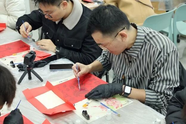 1月23日上午,在线直播 教职工之家举办了一场别开生面的“迎新春——非遗手作金箔画体验活动”。传统金箔技艺与新春的喜庆氛围完美融合,为师生们带来了一场充满创意与温情的文化体验。学院领导、老师与留校学生欢聚一堂,以薄如蝉翼的金箔为笔墨,精心制作出一幅幅寓意吉祥的马年主题金箔画作品。