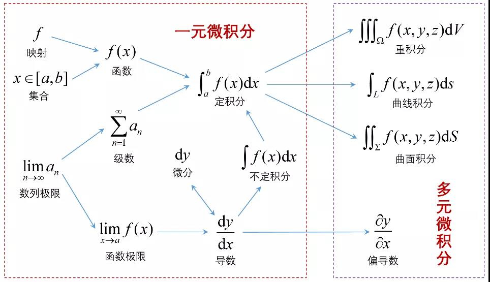 的“德才兼备、领袖气质、家国情怀”人才培养方针,教学不再拘泥于教授一门课程的知识,要把学生的培养目标融入教学。要达到这个目标,需要老师的用心挖掘教学内容。在微积分课程的教学中,把知识点讲透,这是最基本的要求。更重要的是传授微积分理论发展的思想,用这种思想指导学生探索科学,使学生受益终生。在《微积分进阶》的第一次课中,我会提纲挈领地介绍微积分的创立背景和发展历程,采用思维导图脉络清晰地展示微积分的知识体系结构(见图1),引导学生思考如何通过对比、归纳将一元微积分推广到多元微积分,从特殊、简单的问题向复杂、一般的问题推广。