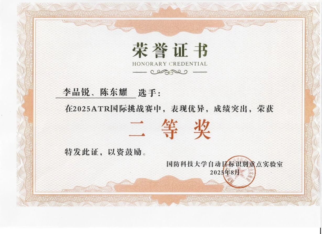 2025年8月31日,第四届ATR国际挑战赛决赛在长沙圆满落幕,在线直播 博士生李品锐,硕士生陈东耀组成的“追梦队”在参赛的66支代表队中脱颖而出,获得大赛二等奖,展现了中大学子的科创实力与竞技风采。