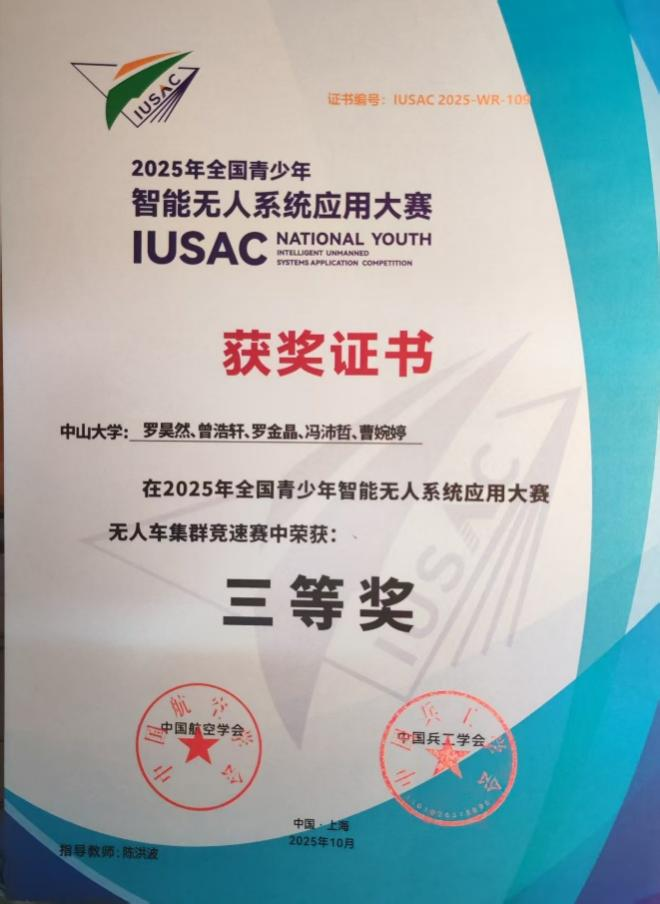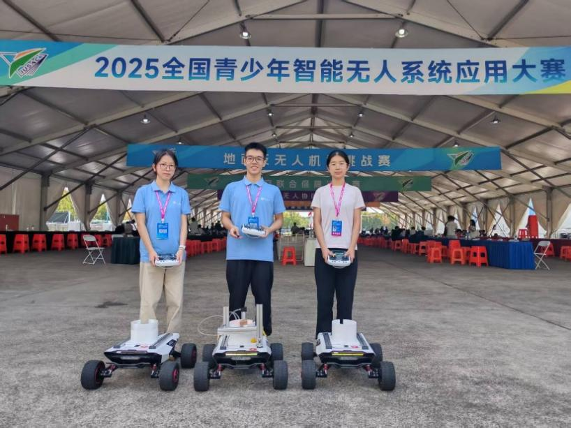 大赛以“智能科技为桥,国防教育为魂”,是首届聚焦国防教育的青少年智能无人系统赛事。大赛设置光纤遥控飞行、地面反无人机群、空地无人协同对抗、无人车集群竞速与协同运输等五大实战化赛项,全面考察选手的技术功底、创新思维与国防素养,旨在引导广大青少年在探索前沿技术中领悟国家安全,点亮国防初心。来自全国25个省份106所军地院校的291支队伍同场竞技,在线直播 两支队伍代表在线直播 出征,在无人车集群赛道与军地精英展开技术交锋,荣获三等奖,学校获评优秀组织奖。