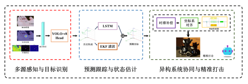 2.系统集成了基于 LSTM 的短时轨迹预测与 EKF 非线性滤波技术,有效缓解了传感器传输与执行机构存在的系统时滞。通过标准 ROS 接口实现异构设备协同,在目标距离 0.8—1.5m 范围内实现了 82.9% 的单次命中率。项目成果已成功迁移至移动底盘定位增强与机械臂高频抓取场景,并斩获中国机器人及人工智能大赛国家级一等奖、“申达杯”无人系统挑战赛国家级一等奖等多项荣誉。