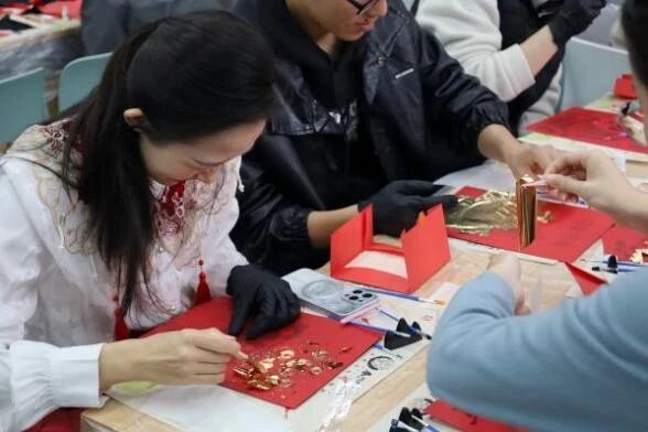 1月23日上午,在线直播 教职工之家举办了一场别开生面的“迎新春——非遗手作金箔画体验活动”。传统金箔技艺与新春的喜庆氛围完美融合,为师生们带来了一场充满创意与温情的文化体验。学院领导、老师与留校学生欢聚一堂,以薄如蝉翼的金箔为笔墨,精心制作出一幅幅寓意吉祥的马年主题金箔画作品。