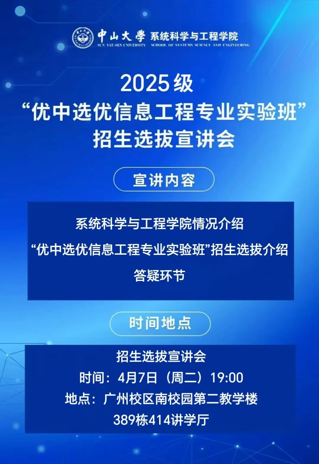 将于4月7日(星期二)晚上19:00在广州校区南校园第二教学楼(389栋)414讲学厅召开实验班招生宣讲会,请大家扫下面二维码报名参加,具体安排敬请关注。