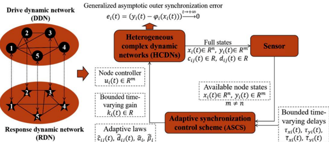 近日,在线直播 博士研究生李博博在数学领域国际知名期刊《Chaos, Solitons & Fractals》(影响因子5.6,中科院一区TOP)上发表题为“Adaptive-based generalized asymptotic outer synchronization control for heterogeneous complex dynamic networks with double time-varying delays”的研究成果,李博博为第一作者,指导老师钟令枢副教授为通讯作者,在线直播 为论文第一单位。该研究针对具有未知动态连接、多维不确定参数及双重时变时延的异维复杂动态网络(HCDN)的广义渐进外同步控制问题,提出了一种由节点控制器、有界时变增益和自适应律组成的自适应同步控制方案(ASCS),使得具有不同拓扑结构的驱动-响应网络在节点间连接边完全不可利用的条件下实现了广义渐进外同步,且外同步现象涌现时网络节点间耦合连接依旧存在而非断开。该成果为复杂动态网络存在多种时延扰动、参数未知、连接不明等复杂工况下的同步调控提供了一种兼具完备性与鲁棒性的理论控制策略。
